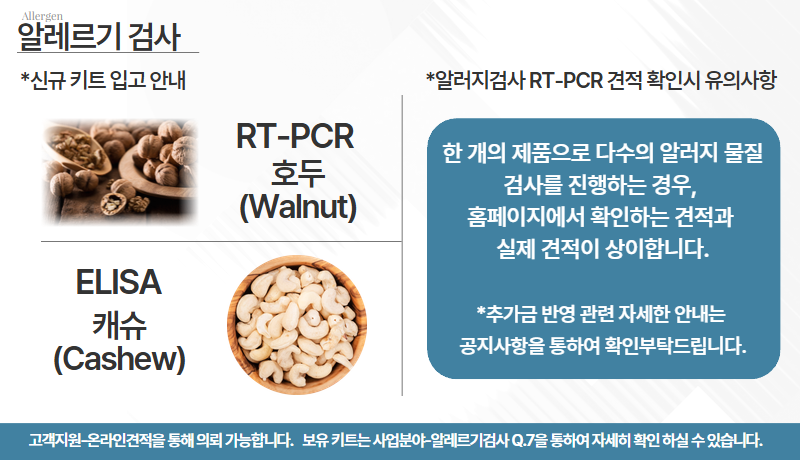 - 바이오푸드랩 홈페이지 온라인 의견 및 검사 의뢰 메뉴를 통해 알레르기 검사(RT-PCR) 견적을 확인하실 때, 홈페이지 추가 금액 반영 방식과 실제 단가 간 차이가 있어 안내 드립니다. - [1] 알레르기 검사(RT-PCR) 단가 안내 - - 알레르기 검사 1종(물질) : 150,000원 (VAT 포함) - [2] 정상적으로 견적 확인이 가능한 경우 - 1. 한 제품으로 알레르기 물질 1종의 견적을 확인할 경우 - 2. 여러 제품으로 동일한 알레르기 물질 1종의 견적을 확인할 경우 - [3] 견적과 실제 단가가 상이한 경우 - -한 제품으로 다수의 알레르기 물질에 대한 견적을 확인할 경우 - · 홈페이지 견적 예시: 4종 선택 시 → 600,000원(VAT 포함) - · 실제 단가: 1종 150,000원(VAT 포함) + 추가 물질(3종 × 30,000원(VAT 포함)) → 총 240,000원(VAT 포함) - 따라서 현재 홈페이지에서 확인되는 견적과 실제 단가에 차이가 발생하며, 실제 견적은 영업 담당자 확인 후 수정 반영됩니다. - 해당 부분은 홈페이지 기능 개선을 통해 보완될 예정이며, 앞으로는 고객 여러분께 혼선이 없도록 정확한 견적 확인이 가능하도록 하겠습니다. - 바이오푸드랩은 항상 고객 편의성을 최우선으로 생각하며, 더 나은 서비스 제공을 위해 지속적으로 노력하겠습니다. - 감사합니다.